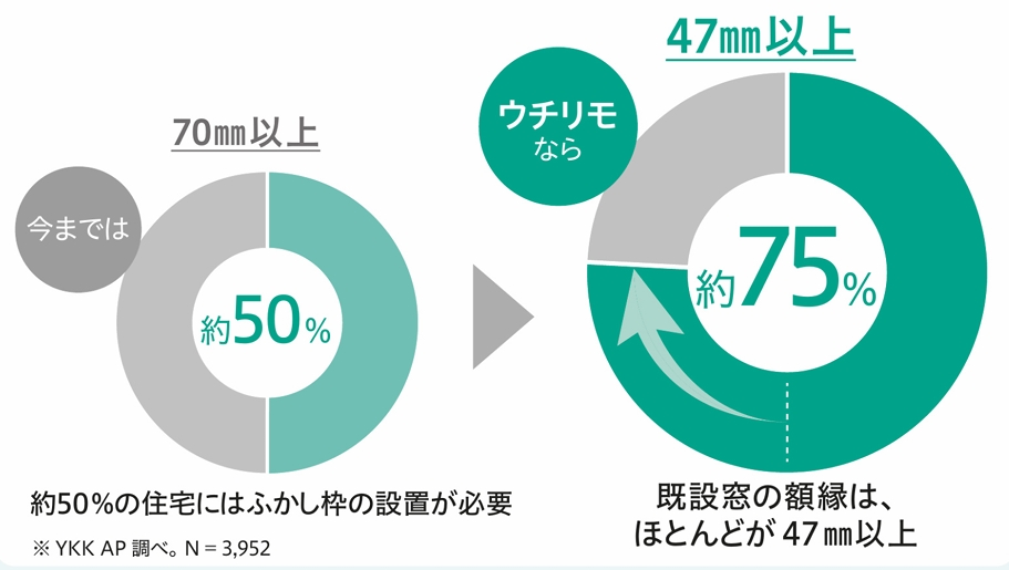 しかし、ウチリモを使用することでふかし枠なしで既築物件の約75%の窓に取り付けが可能になりました。